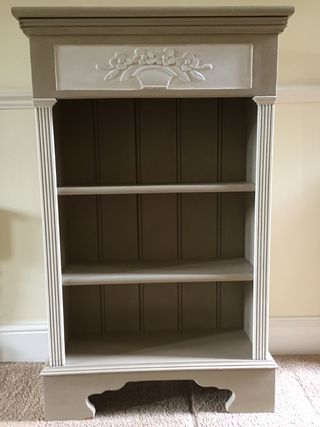 Pine bookcase painted with Annie Sloan Country Grey and Old White chalk paint then two coats of clear wax applied. The bookcase is in good condition and a solid piece of furniture. The shelves are fixed and not adjustable.