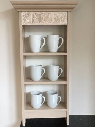Attractive spice rack which would make a nice feature in any kitchen. The unit has been painted with Rust-oleum butterscotch chalk paint and then had two coats of clear wax applied. (Mugs Not included)